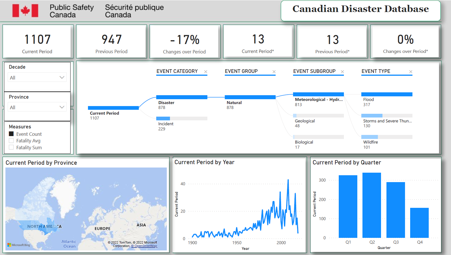 - Explored Canadian disaster incidents by years, type of disaster, fatality and location